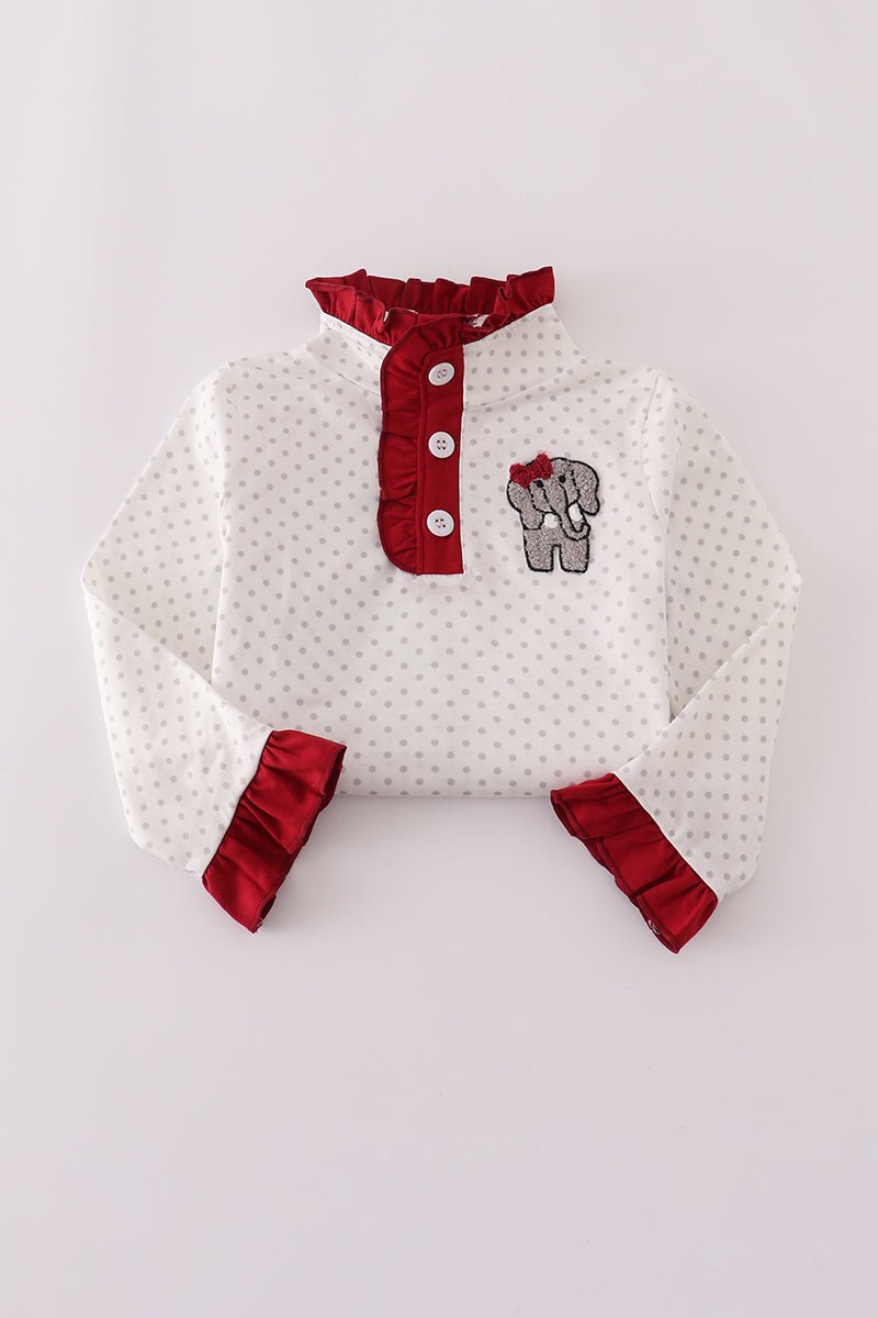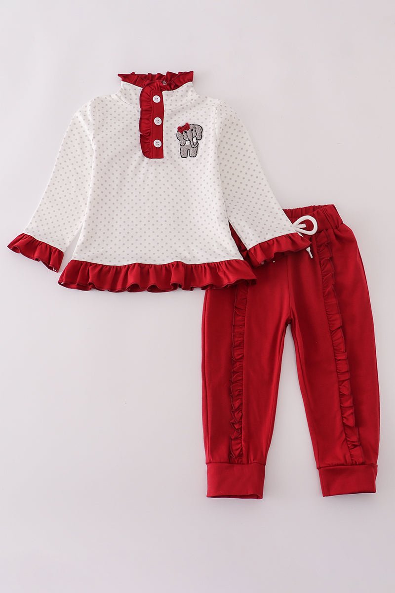 Bring a splash of fun to your little one’s wardrobe with the Alabama polka dot elephant French knot ruffle pants set. Featuring charming polka dots and adorable elephant accents, this playful outfit combines comfort with whimsical style. The delicate French knot ruffles add a sweet, textured touch, perfect for playdates or special occasions. Soft and breathable, it keeps your child cozy while turning heads with its unique design.